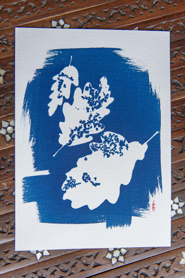Empreinte cyanotype A5 - "Le vent et le temps", feuilles de chêne
